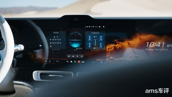 夜间行驶时,数字大灯能照亮前方细沙;寒冷环境下,热泵高效供暖;在阳光炽烈的28度 沙地中,空调依旧安静而高效。甚至能进行视频会议,屏幕会自动识别驾驶员视线,并遮蔽不安全的注意转移。